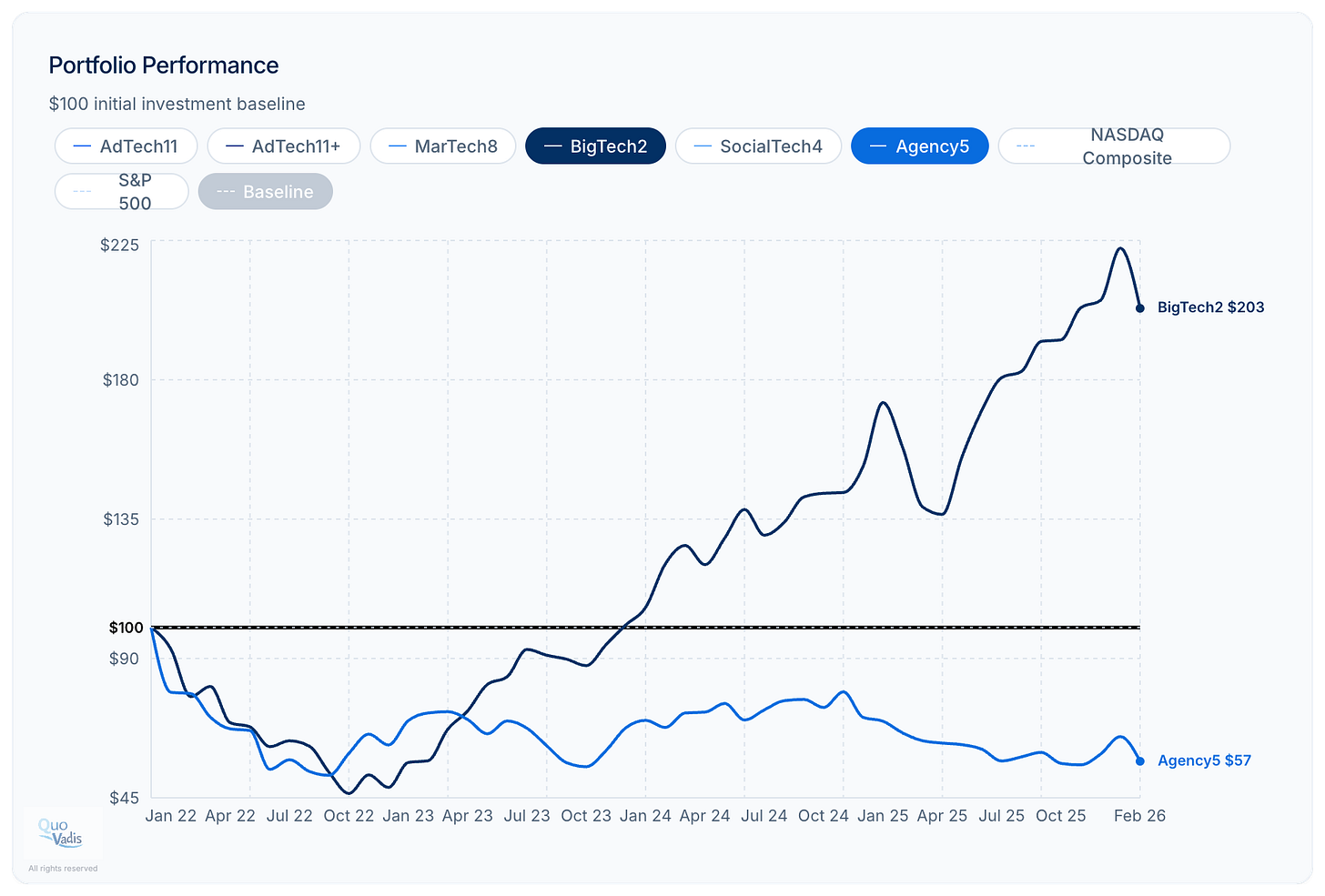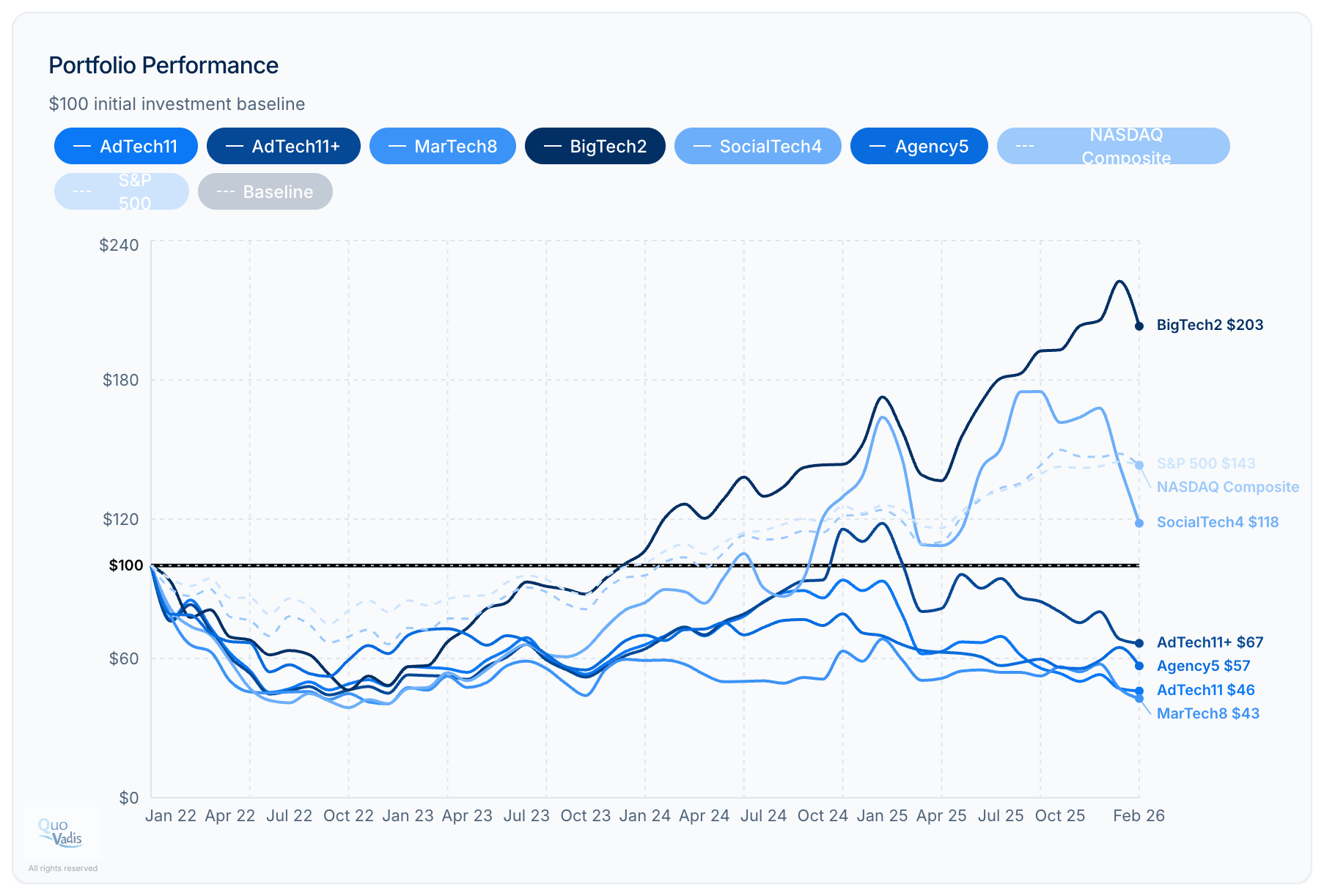 As a reminder, each portfolio starts with a $100 investment divided equally across all constituent stocks. If a company exits public life (e.g., IAS) or a relevant company goes public (e.g., MNTN), we remove or add it and rebalance on an equal-dollar basis.