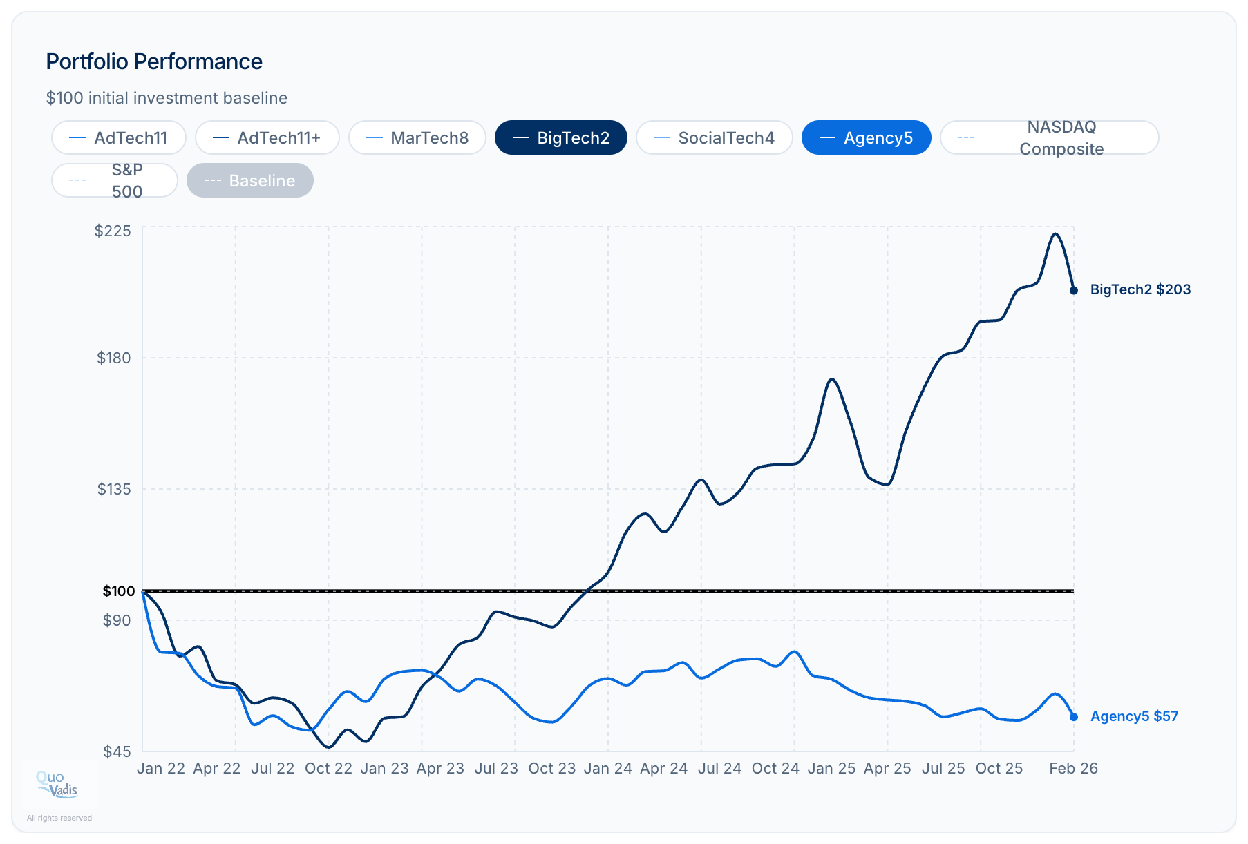 Our agency portfolio consists of WPP, Publicis, Omnicom, Stagwell, and S4 Capital (SFOR.L). Note that IPG was removed following its acquisition by Omnicom, making the combined agency the largest in the world and displacing Publicis (for now).