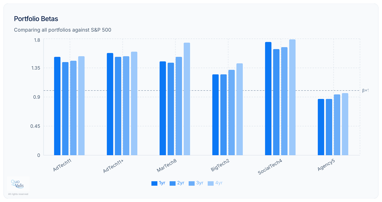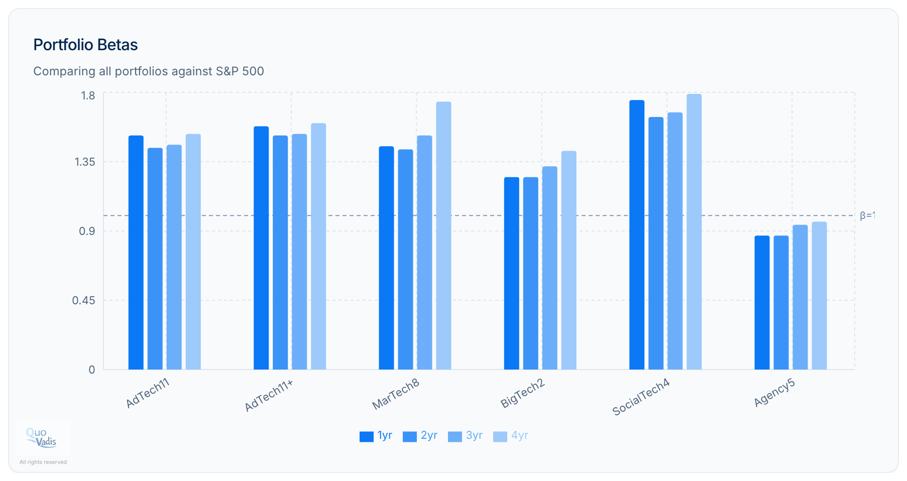 Looking at betas across our AdTech and MarTech portfolios, they are relatively high, ranging from ~1.3 to ~1.8. High betas materially affect the cost of equity and the overall cost of capital. In a tightening cycle with AI opportunities and threats everywhere, players with higher discount rates disproportionately affect efforts to create long-duration cash flow streams. The result is valuation pressure and multiple compression, even if operating performance remains intact.