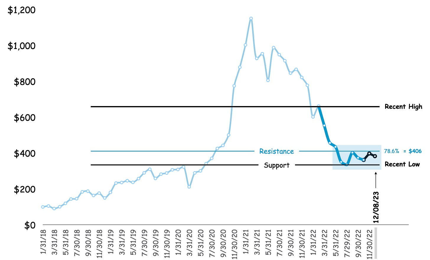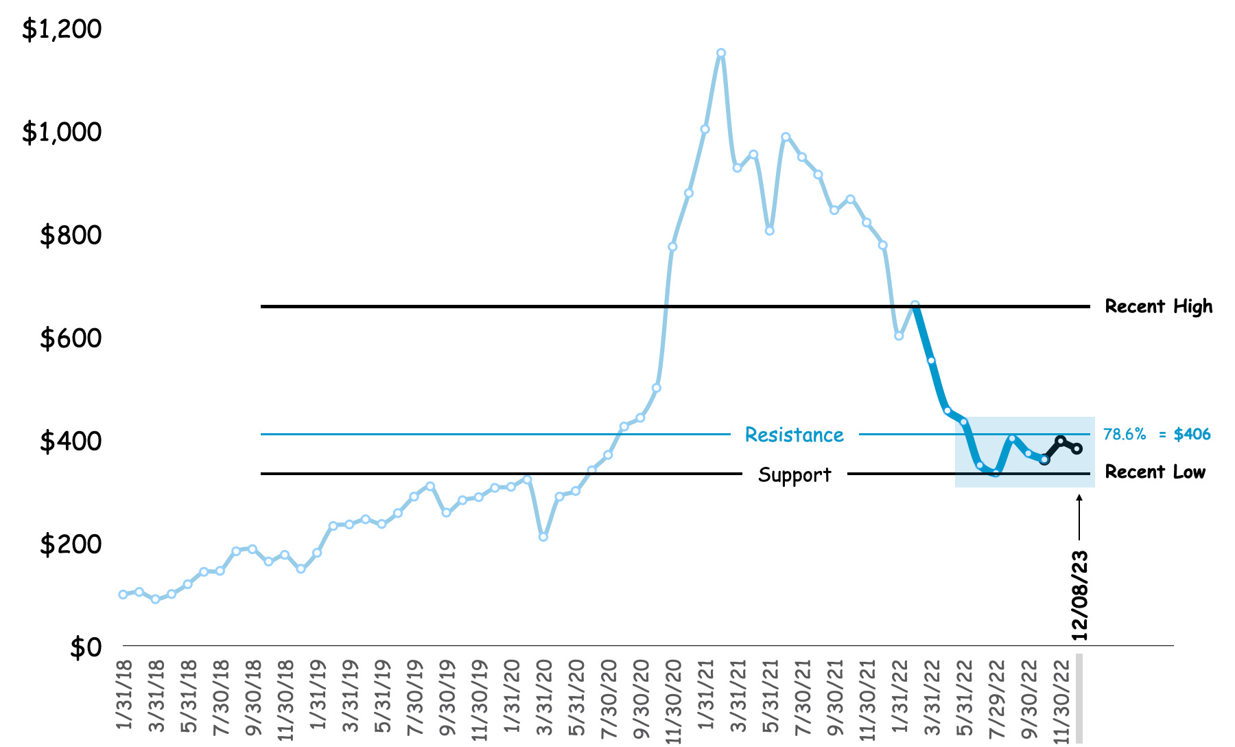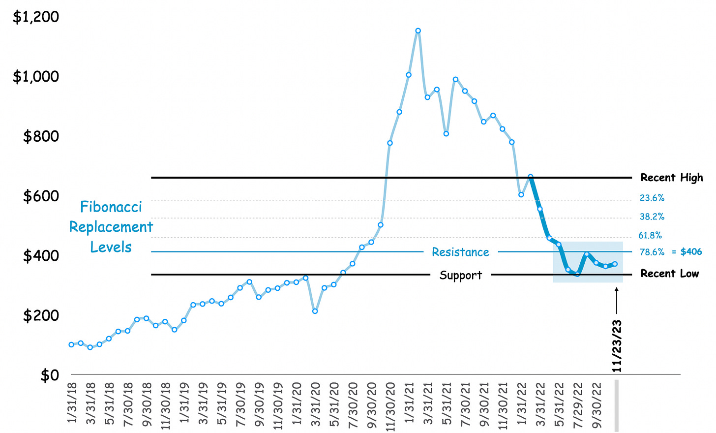 Here’s what it looked like on November 23. We started with the most recent high from February 28 at $662 and the recent low of $336 at the end of July to set an upper and lower boundary. So simple.